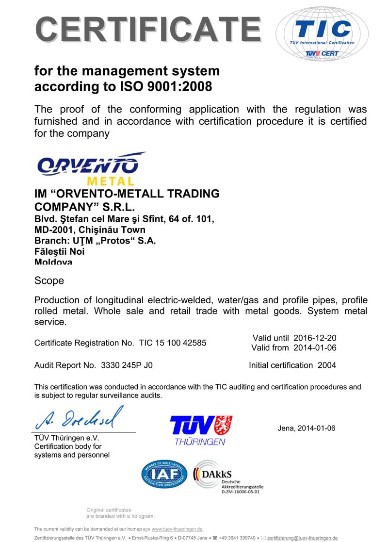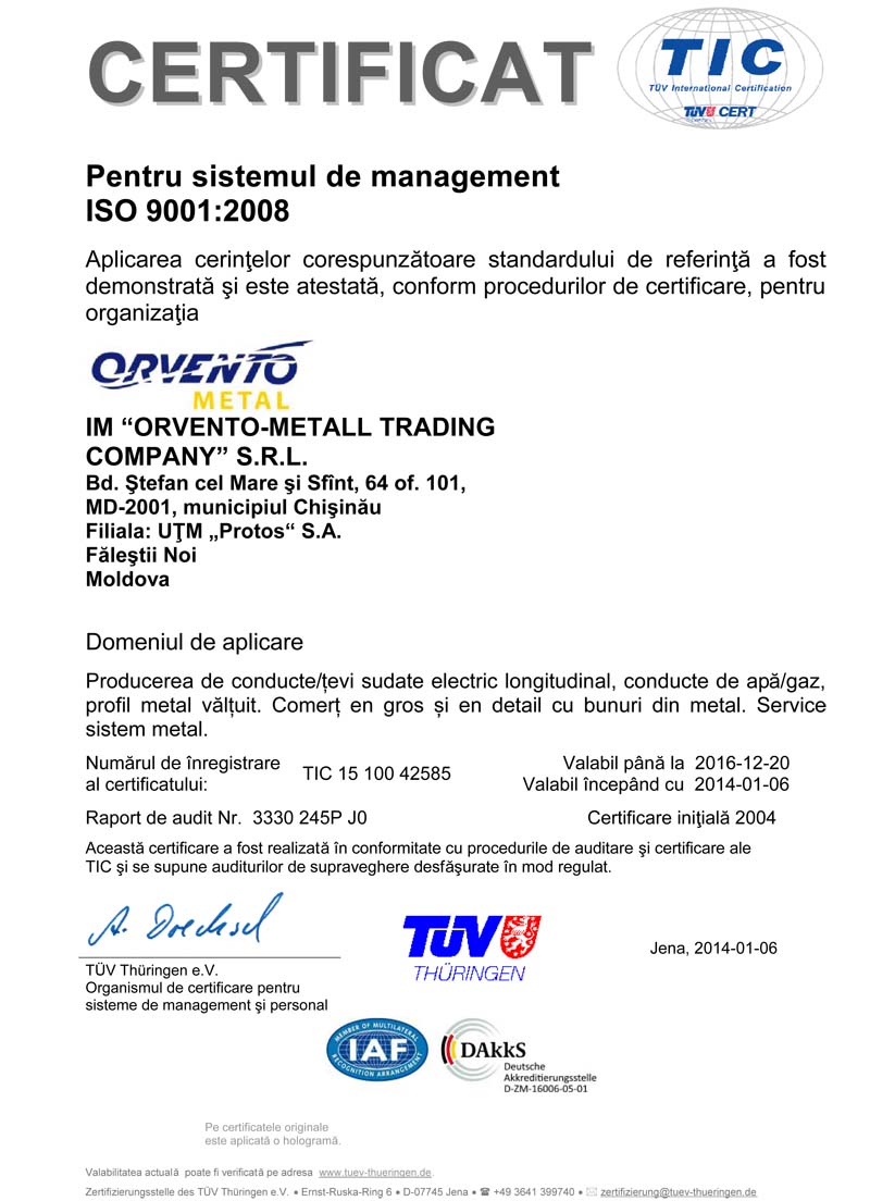 Миссией АО Молдавского трубного завода “Protos” и «Orvento-Metall Trading Co» SRL является производство и продажа сварных труб из углеродистой стали для продуктопроводов, монтажа и металлоконструкции, а также металлопродукции других производителей и осуществление оптимального металлосервиса на внутреннем и внешних рынках.